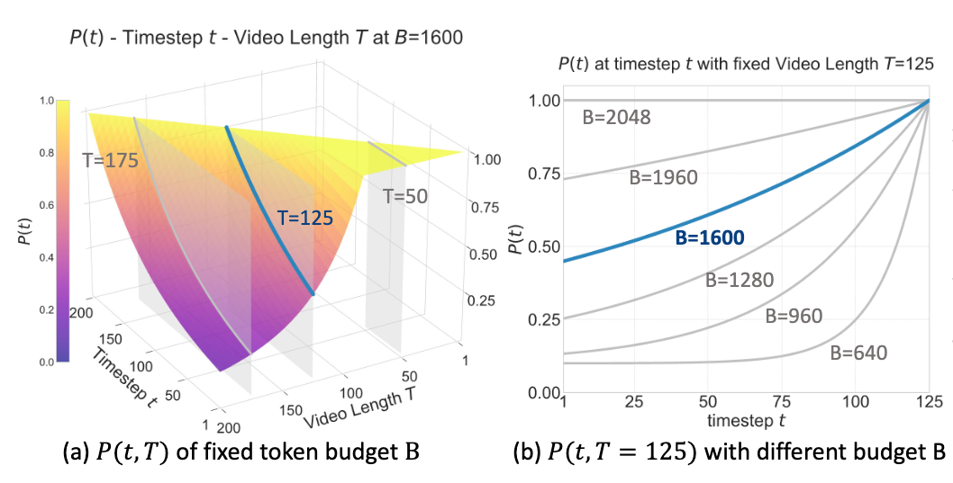 这套遗忘曲线可以根据视频帧数自适应的调整采样分布(上图左),而当tokens上限改变(上图右,更好的显卡或者更差的显卡),这套采样同样可以自适应调整分布,更大的token上限则可以保留更多的关键帧(曲线更缓),更少的token上限则更多的保留最新的关键帧(曲线更陡)。