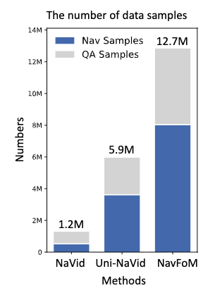团队收集了八百万条导航数据,包括视觉语言导航、目标导航、目标跟踪、自动驾驶、网络导航数据,涵盖了轮式机器人、四足机器狗、无人机和汽车,以及四百万条开放世界的问答数据。