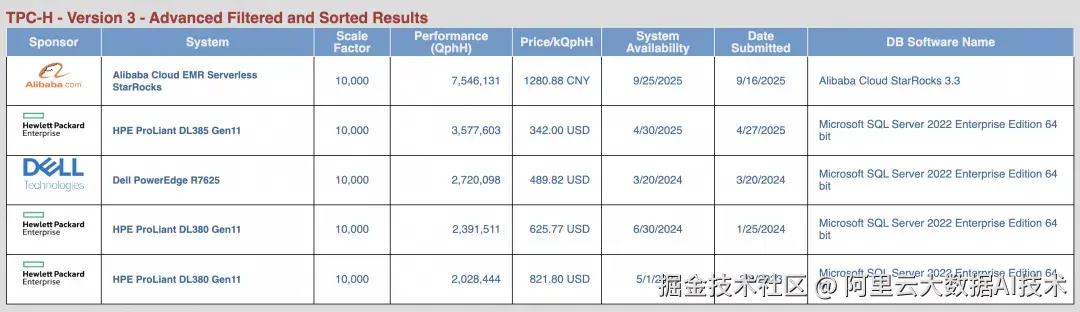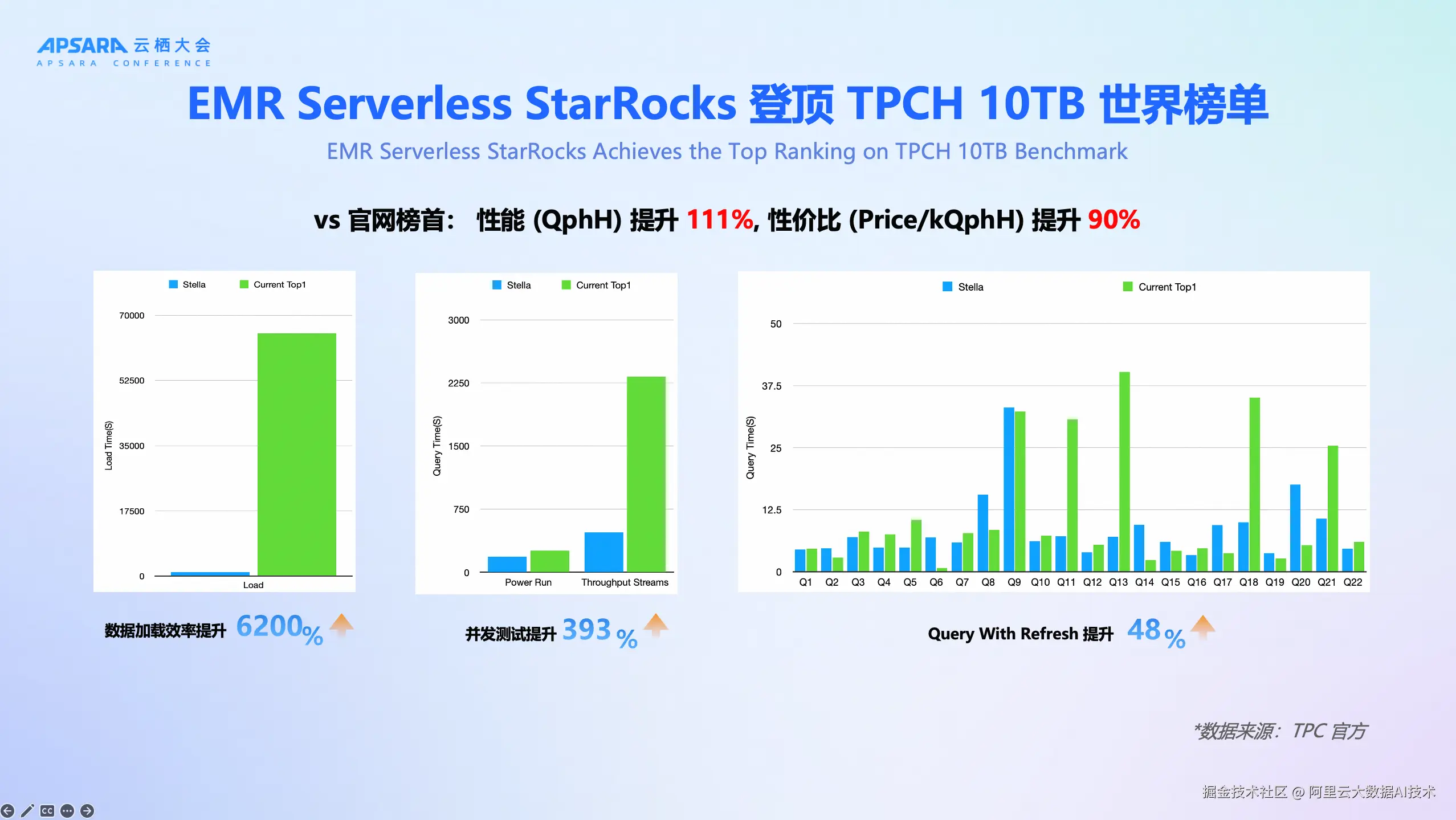 EMR Serverless StarRocks在权威TPC基准测试中创造佳绩:在“数据分析”性能测试TPC-H榜单中,阿里云EMR Serverless StarRocks (Stella 1.2.0内核)以QphH超754万分的性能结果斩获全球冠军,领先第二名111%;