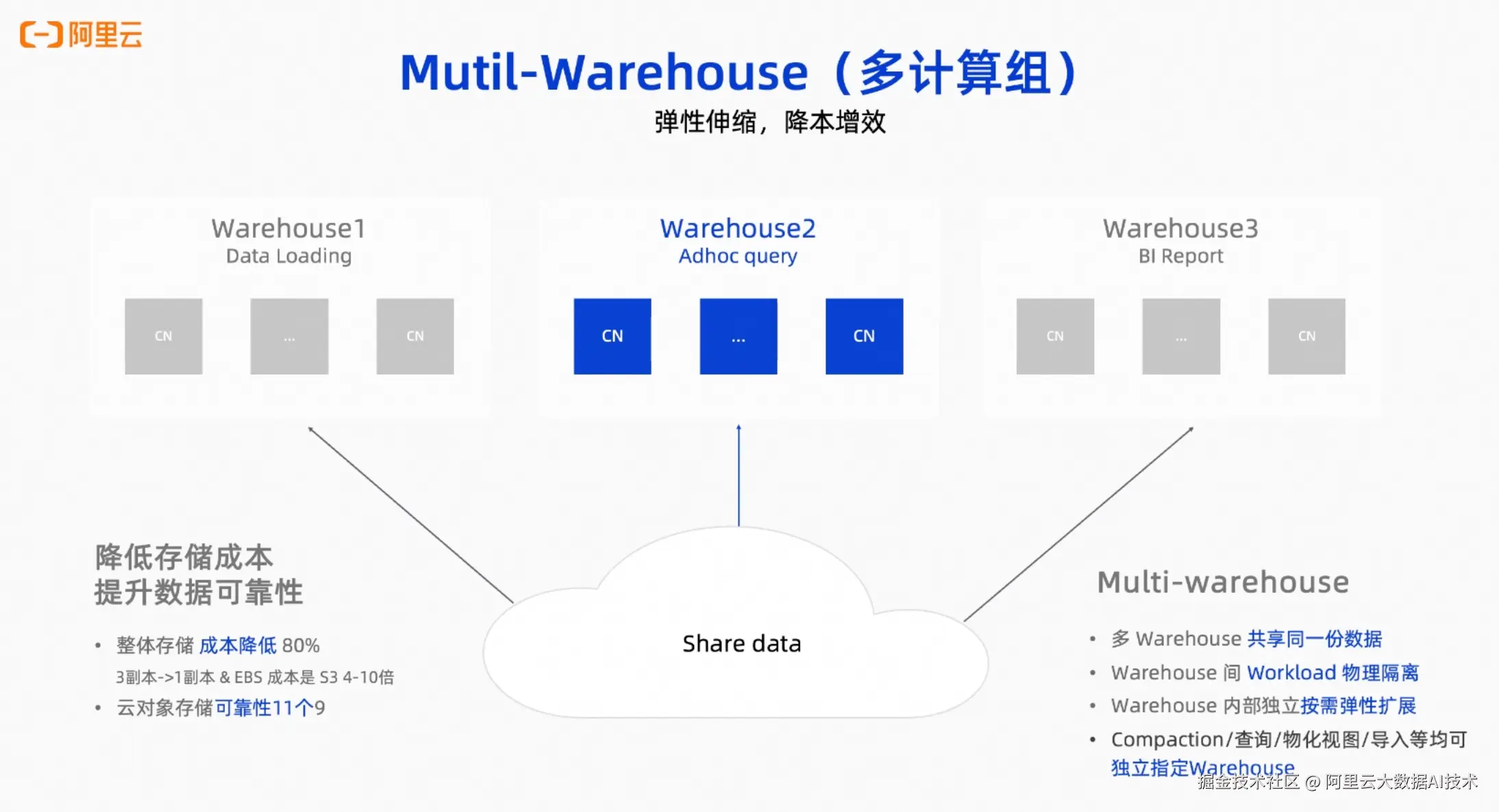 - 数据共享与计算隔离:多个Warehouse共享同一存储层(如OSS),实现数据高效共用;计算资源通过硬隔离机制独立分配全面资源隔离:最新版本支持Compaction指定运行在特定Warehouse中,避免资源集中争抢弹性伸缩协同:与弹性伸缩能力结合使用,可根据业务需求动态调整计算资源规模,白天高峰扩容、夜间低峰缩容,在保障性能的同时有效控制成本