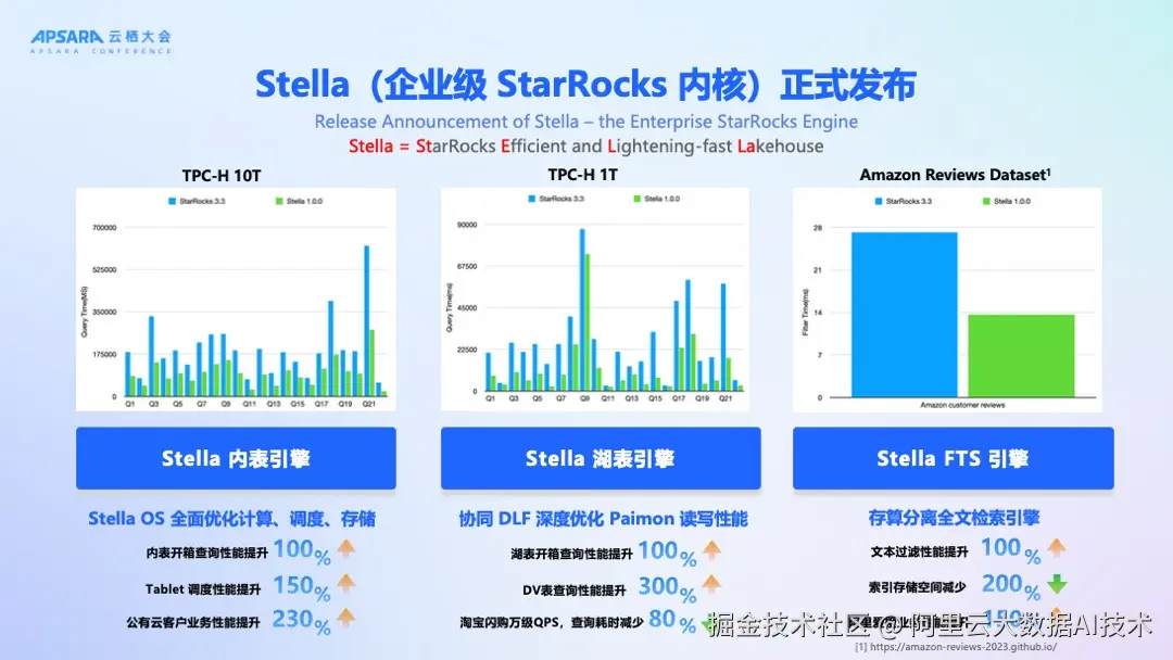 2025 年云栖大会,EMR Serverless StarRocks重磅发布全新企业级版本内核Stella (StarRocks Efficient and Lightening-fast Lakehouse),完全兼容开源StarRocks,为用户提供企业级的产品功能、卓越的性能及稳定性保障。