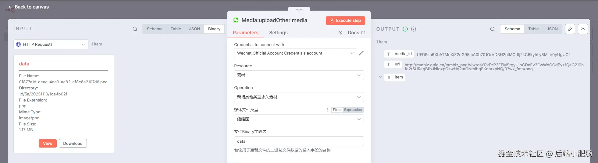 Media:uploadOther media(上传封面图):HTTP Request1节点出来后点击【+】新增Media:uploadOther media。 这个节点的作用是上传图片链接并返回一个media_id,后续填充到公众号封面中。