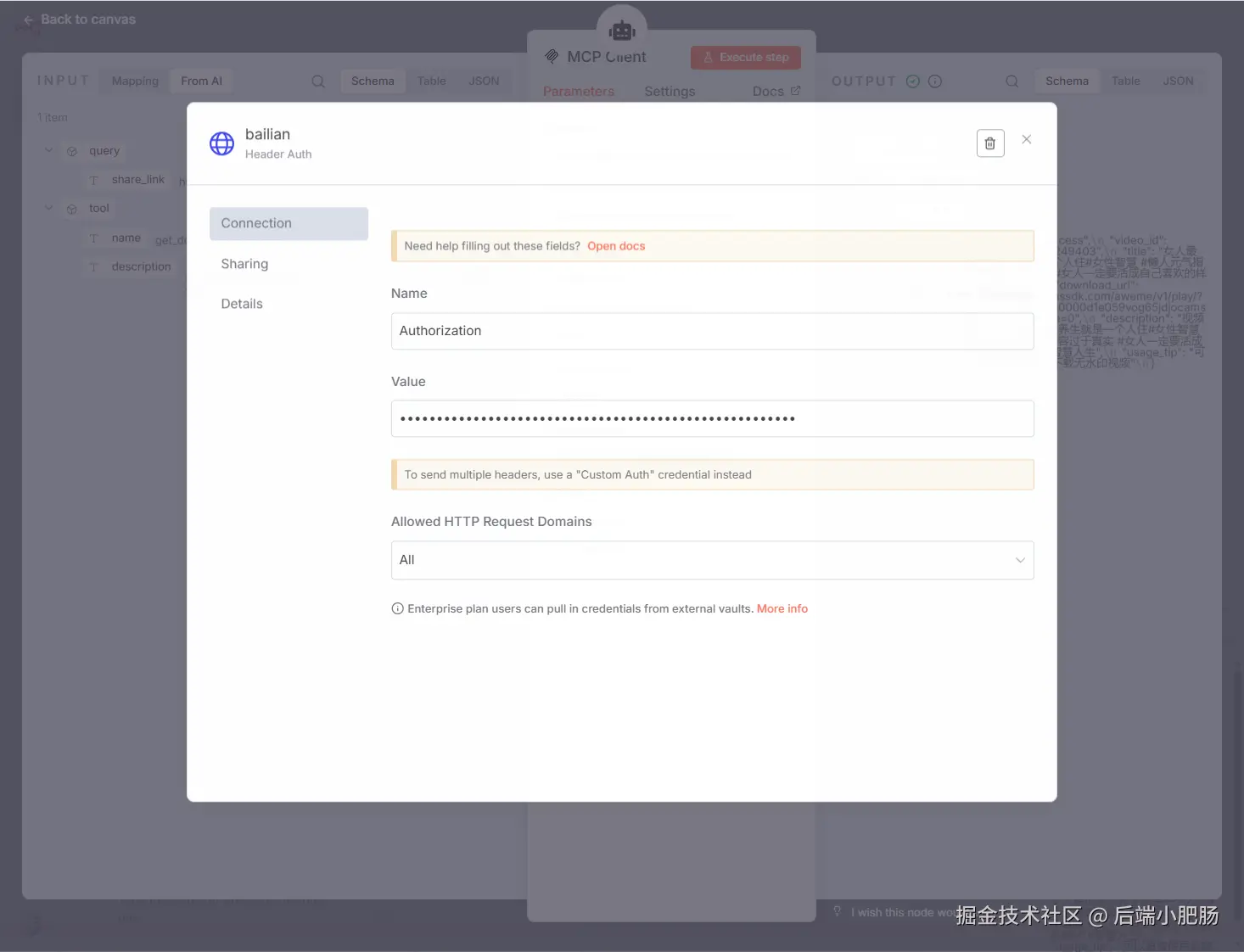 Credential for Header Auth点击Create new credential,Name填写Authorization,Value填写阿里云百炼的key(bailian.console.aliyun.com/?spm=a2c4g.…**