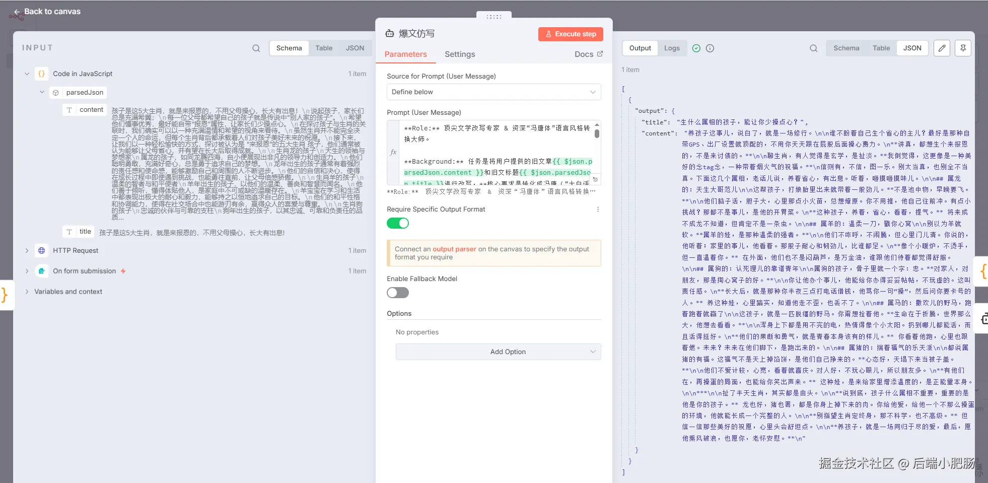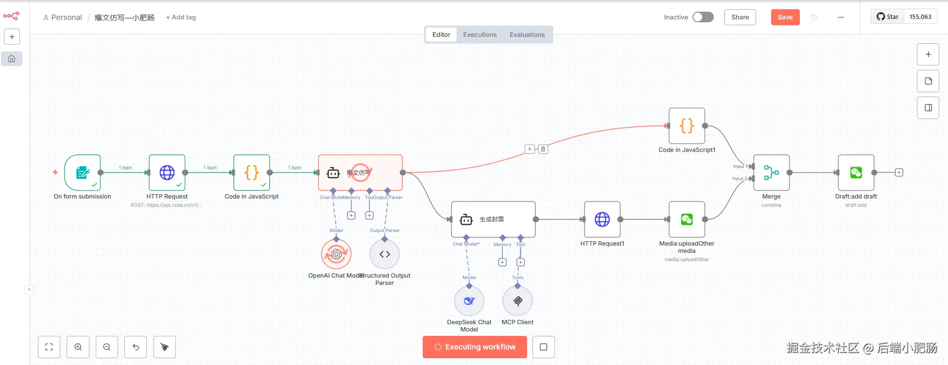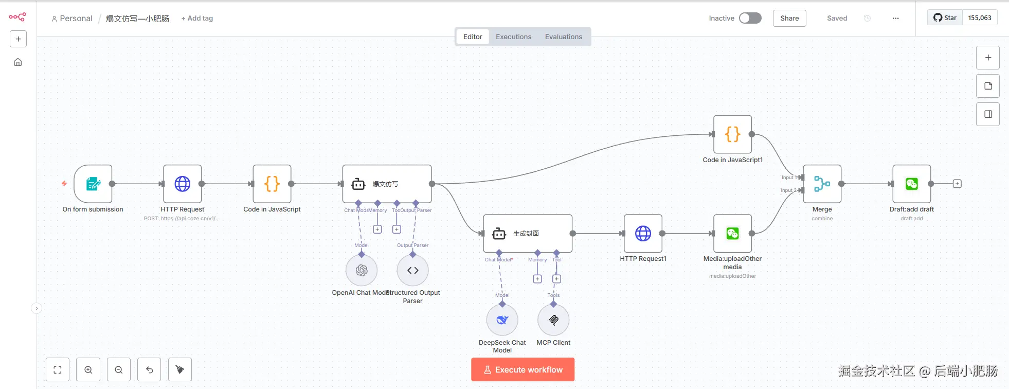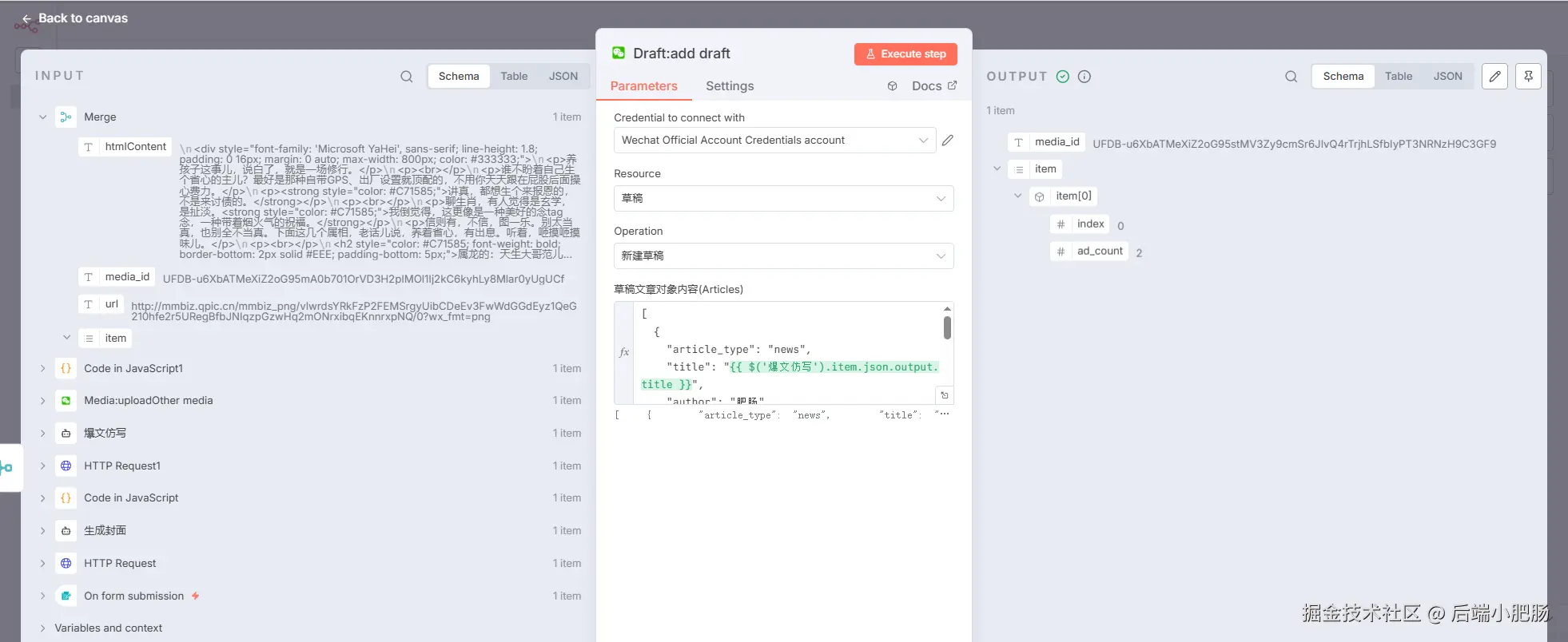 [ { "article_type": "news", "title": "{{ $('爆文仿写').item.json.output.title }}", "author": "小肥肠", "content": "{{ $json.htmlContent .replaceAll("\n", "\n") .replaceAll("\r", "\r") .replaceAll(""", "'") }}", "thumb_media_id": "{{ $json.media_id }}", "show_cover_pic": 1, "need_open_comment": 1, "only_fans_can_comment": 0 }]以上就是整个工作流的完整流程拆解,动手能力强的读者可以跟着教程实践一遍。如果想直接获取工作流,可以加入社群后我拉你进空间直接学习使用。
