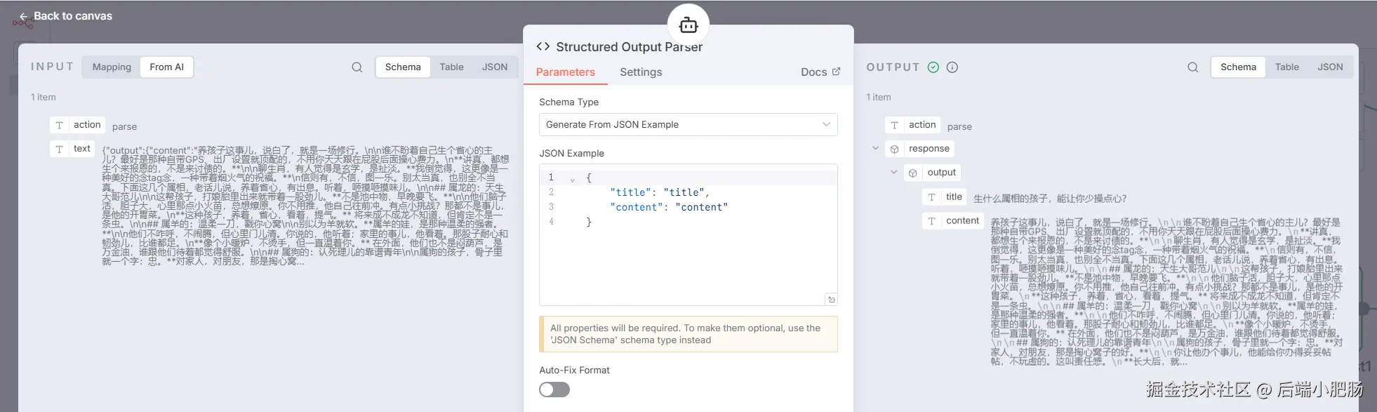 - 在Chat Model处点击【+】,新增聊天模型。在Output Parser处点击【+】,规整输出格式,JSON Example处填入: