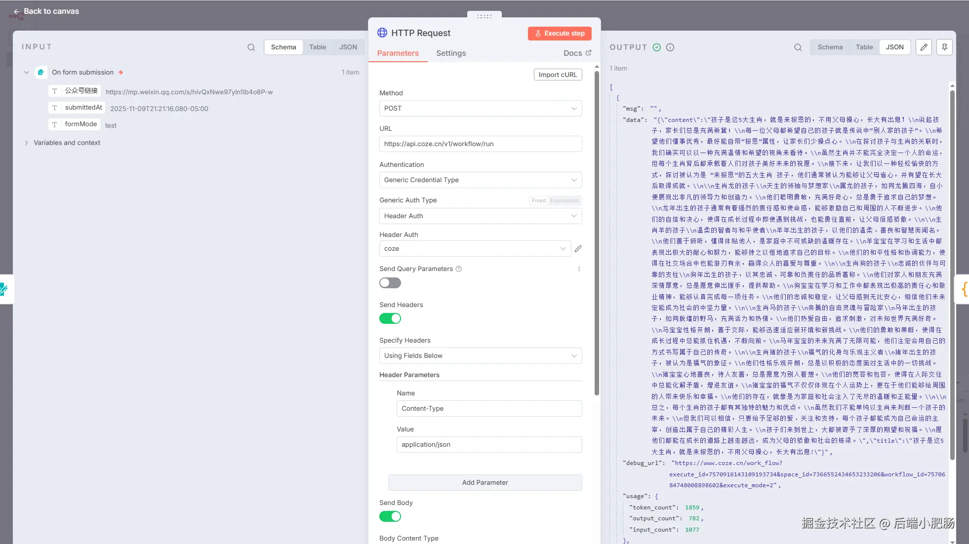 - Method填写POST。URL填写api.coze.cn/v1/workflow…Generic Auth Type选择Header Auth。Header Auth填写Coze的凭证打开Send Headers,Specify Headers选择Using Fields Below,Header Parameters中Name填写Content-Type,value填写application/json。打开Send Body,Body Content Type选择JSON,Specify Body选择Using JSON,JSON中填写: