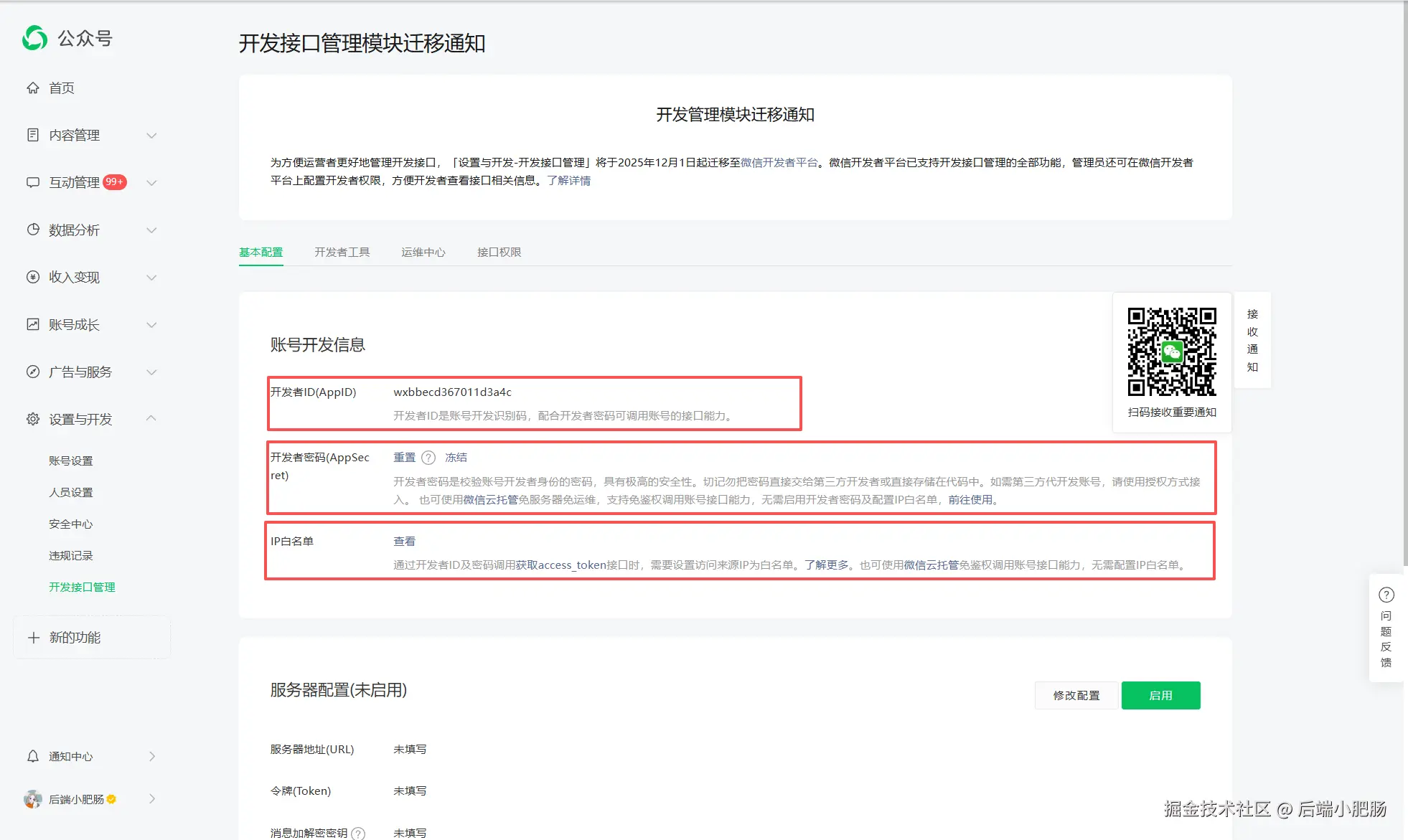 将公众号后台的appid和secret填入上述表单,同时需要将你的公网ip配置到白名单当中,公网ip获取指令为:curl ipinfo.io/ip。