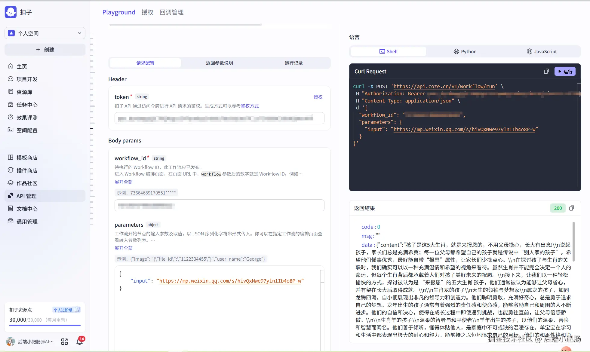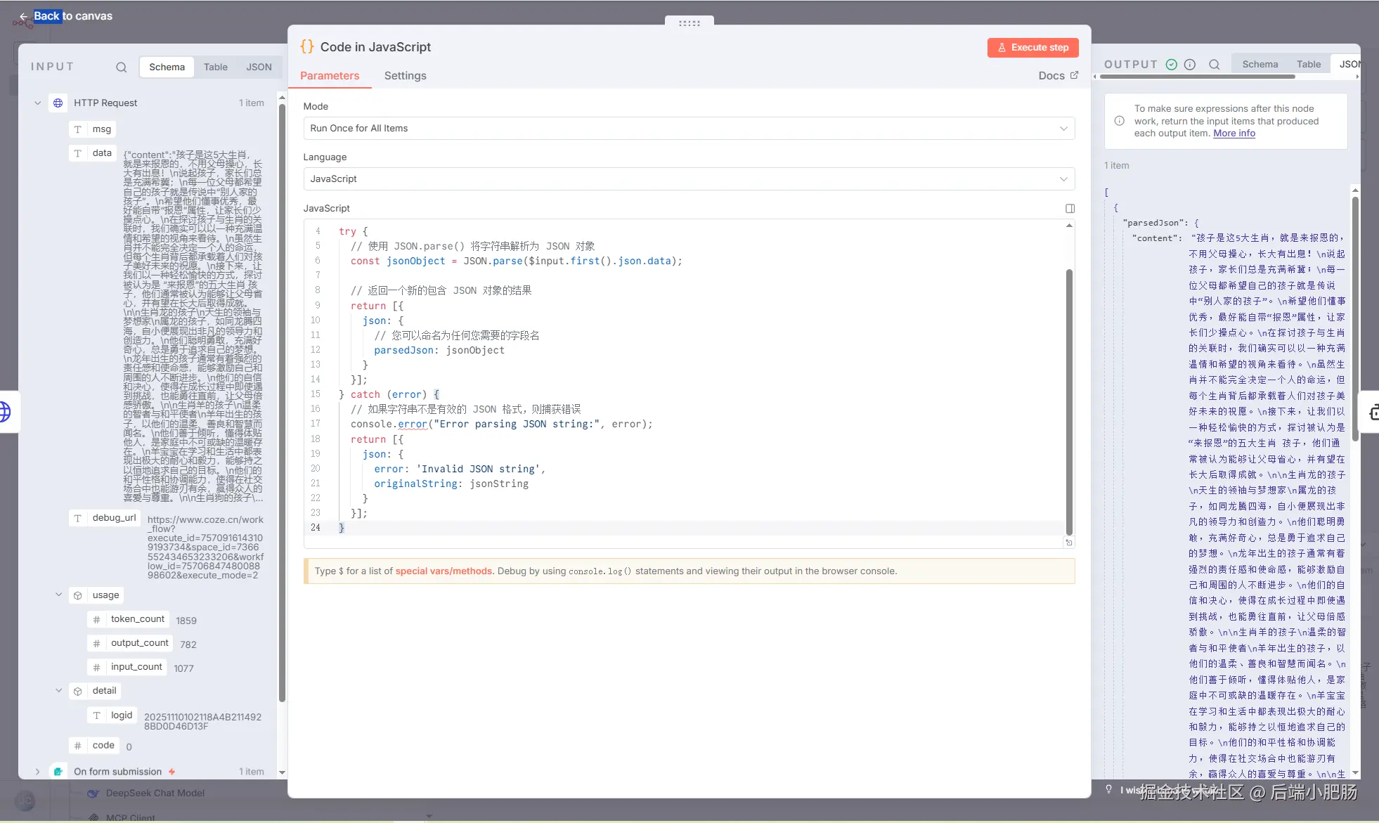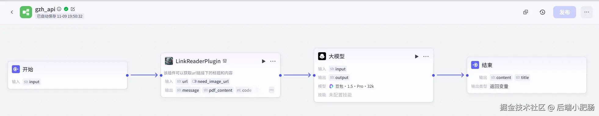 { "workflow_id": "你的Coze工作流id", "parameters": { "input": "{{ $json['公众号链接'] }}" }}Coze工作流搭建很简单,就三个节点,核心就是通过Coze插件来获取公众号文章链接内容并清洗文章数据,排除干扰项(如发布时间这些无意义的字)后进行输出: