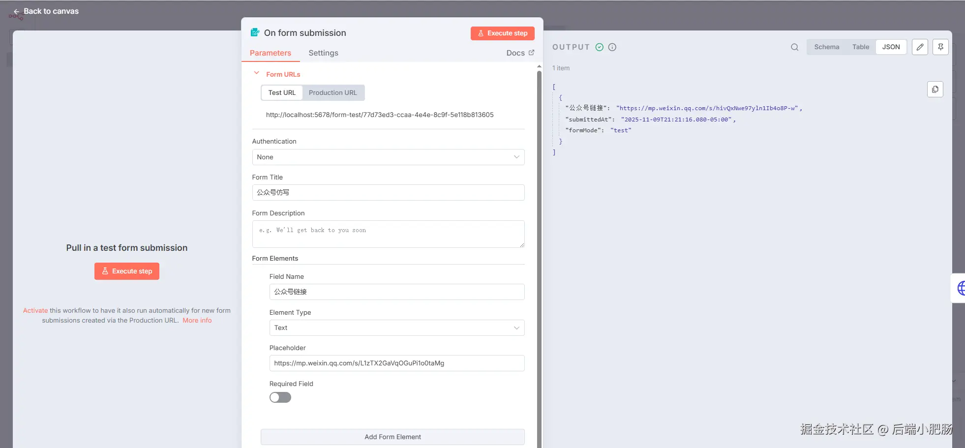 - Form Title填写公众号仿写点击 【add Form Element】 节点新增表单要素,在Field Name填入公众号链接,Element Type选择text,Placeholder任意填入一个公众号文章链接。