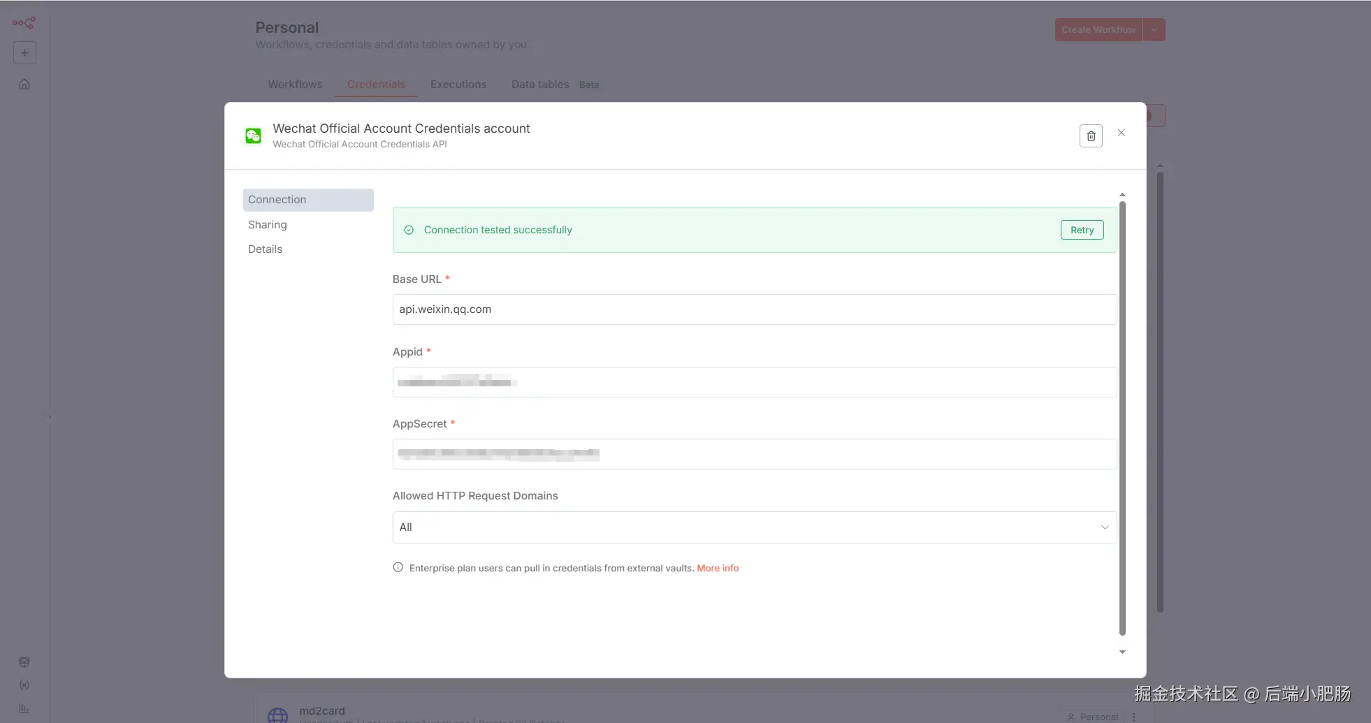 安装完成后需要回到n8n界面,新建凭证(Wechat Official Account Credentials account):