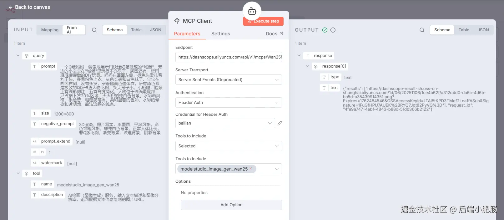 - Chat Model处点击【+】新增OpenAI Chat Mode(或DeepSeek Chat Model)。Tool处点击【+】新增MCP Client Tool用于图片生成。