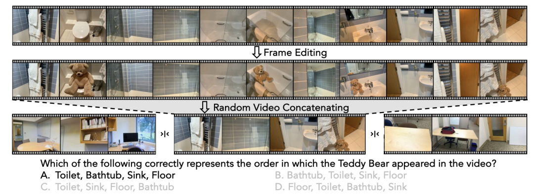 长时程空间记忆。团队使用扩散模型编辑视频,插入一些不合上下文但视觉上融合的物体(而不是随机的「大海捞针」式物体)。