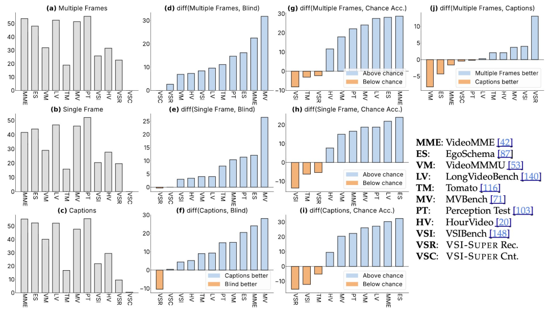许多视频基准测试甚至不需要真正的感知能力;正如团队所展示的,仅仅依靠单帧图像或字幕就能获得高分。