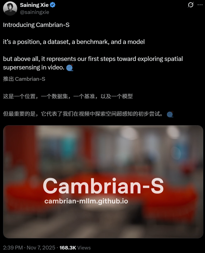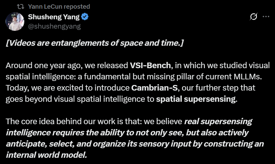 最近,Yann LeCun、李飞飞和谢赛宁联手发了一篇论文——「Cambrian-S:迈向视频中的空间超感知」。