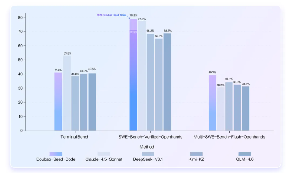 与 TRAE 开发环境深度结合后,Doubao-Seed-Code 在 SWE-Bench Verified 榜单中达到78.80%的成绩,取得了新的 SOTA。