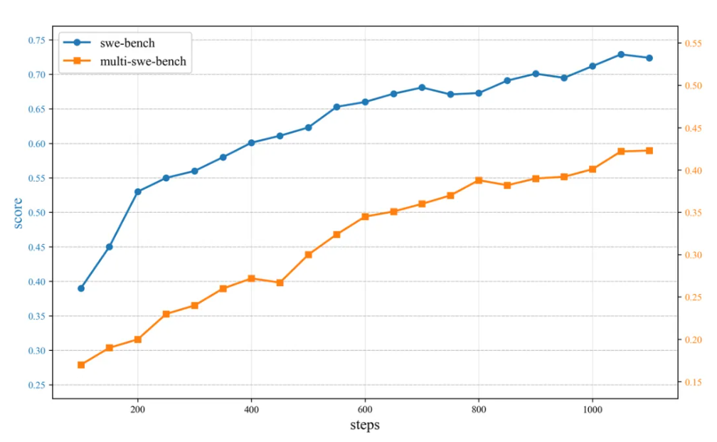 训练结果显示,模型在 Multi-SWE-Bench 和 SWE-Bench-Verified 两个数据集上的表现稳定上升,展现出良好的泛化能力。在 SWE-Bench 基准测试中,仅依赖 RL 训练的 Doubao-Seed-Code 模型就可达到最优水平,表明纯强化学习在真实编程场景下具备潜力。