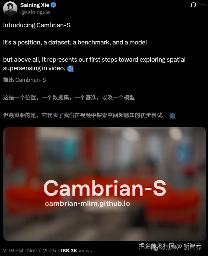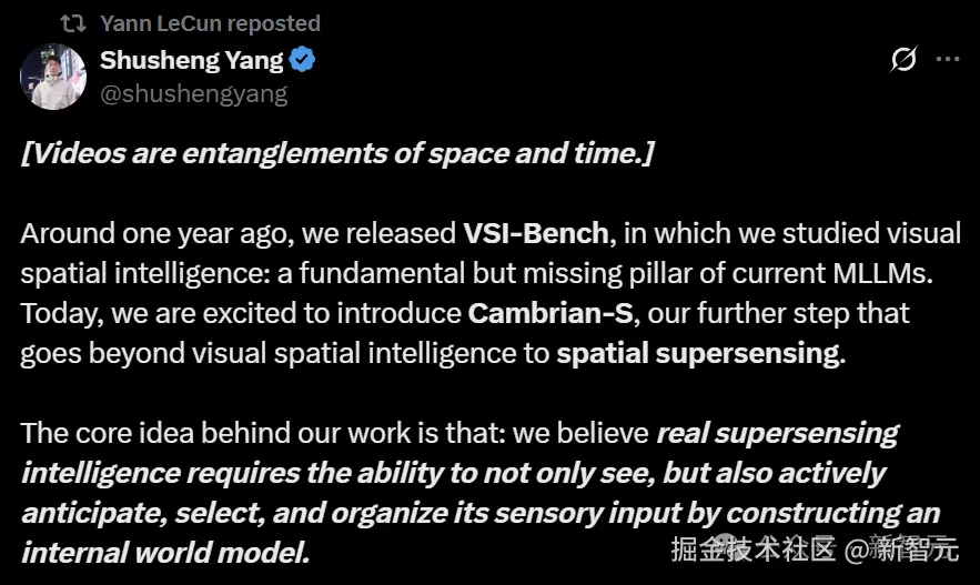 最近,Yann LeCun、李飞飞和谢赛宁联手发了一篇论文——「Cambrian-S:迈向视频中的空间超感知」。