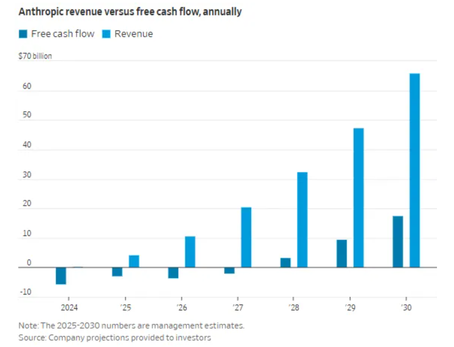 据报道,Anthropic毛利率将从去年的负94%跃升至2025年的50%,并在2028年达到77%。其开发者工具Claude Code年化收入接近10亿美元,API收入预计达38亿美元,超过OpenAI同类业务。公司今年9月以1830亿美元估值完成130亿美元融资,分析师预测未来估值或达3000亿至4000亿美元。