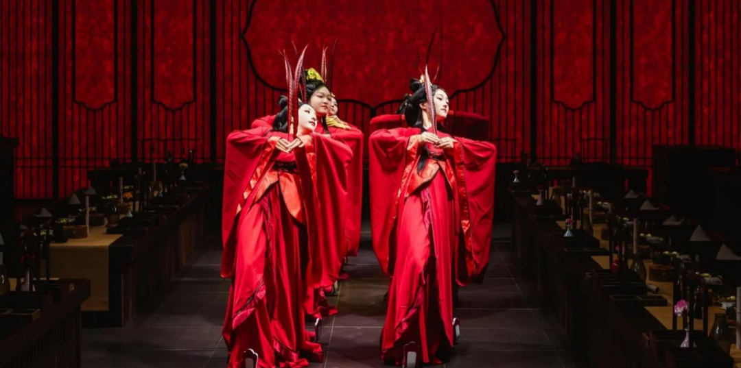 一进门,就有“侍卫”和“宫女”作揖行礼,入座后,又有专人奉茶、伺候沐手、焚香,还没等人回过神来,奏乐响起,台下宾客已经在一场接一场的舞剧中品尝佳肴。