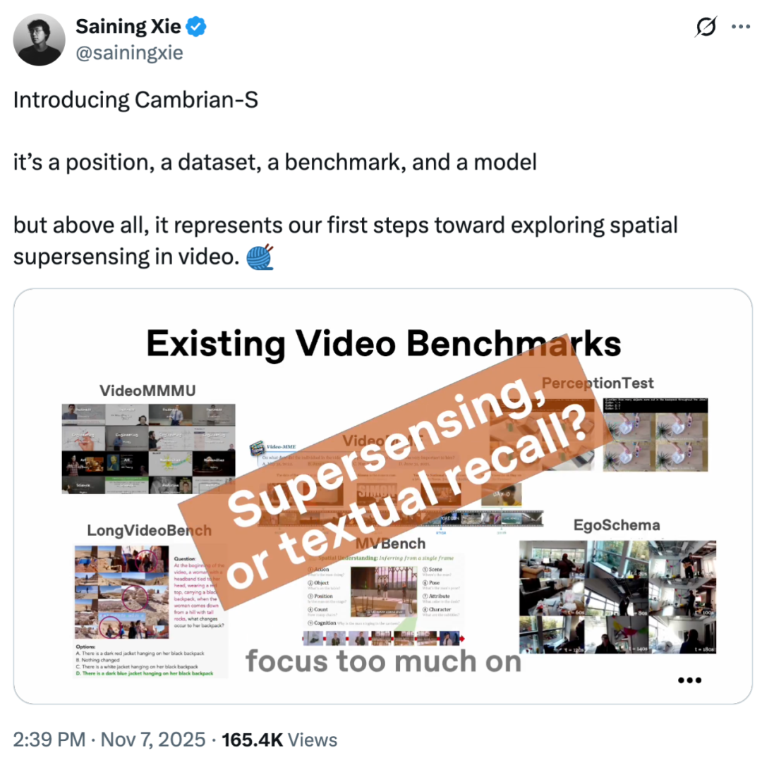 这次的成果名为「Cambrian-S」,根据谢赛宁的说法,它既是一种观点,也是一个数据集、一个基准或者一个模型,代表其迈出了探索视频空间超感知的第一步。
