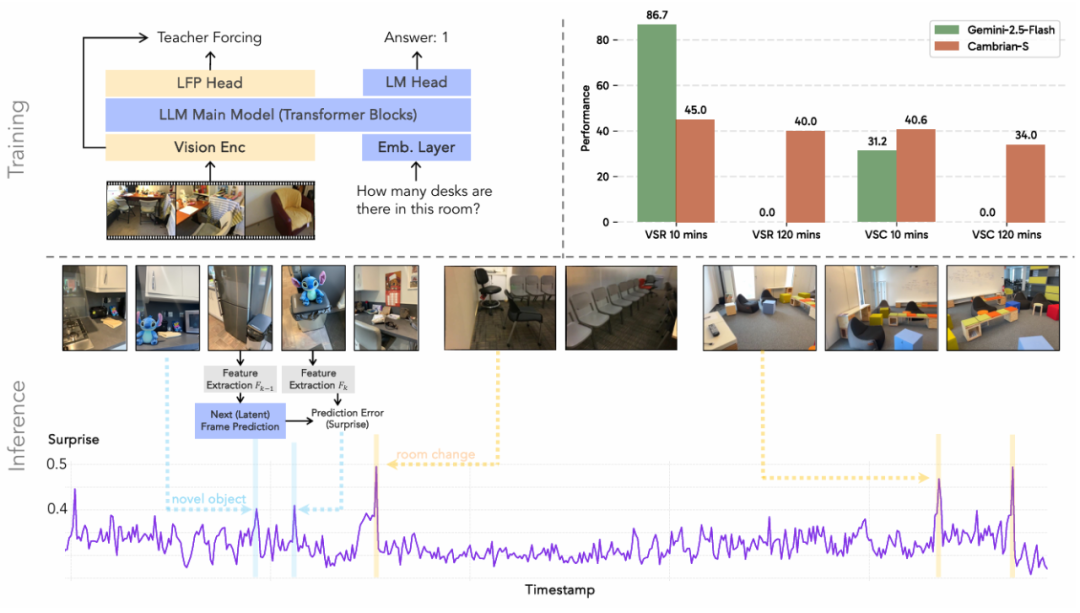 研究者通过一种自监督的下一潜在帧预测方法来构建这一概念的原型。由此产生的预测误差可作为两个关键能力的控制信号:用于选择性保留重要信息的内存管理,以及用于将无界流分割成有意义的块的事件分割。研究者通过在 VSI-SUPER 上的两个案例研究证明,该方法显著优于强大的长上下文和流式视频模型基线。
