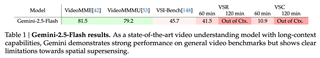 尽管研究者的基准是合成的,但它反映了空间超感知中的一个真正挑战:人类能毫不费力地整合和保留来自持续数小时或数年的感官体验中的信息,但当前模型缺乏用于持续感知和记忆的相应机制。Gemini-2.5-Flash 在以语义感知和语言理解为重点的视频基准(如 VideoMME 和 VideoMMMU)上表现出强劲性能,实现了约 80% 的准确率。