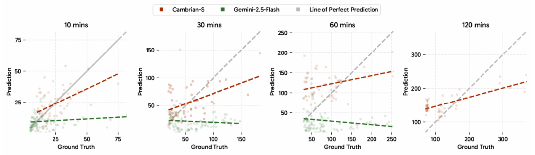 图 14 的更深入分析显示,Gemini-2.5-Flash 的预测被限制在一个有限的范围内,并且不会随着视频中出现更多物体而扩展。相比之下,Cambrian-S (带惊讶度分割) 产生的计数虽然尚未完全准确,但与真实物体数量表现出更强的相关性,表明其具有更好的泛化能力。