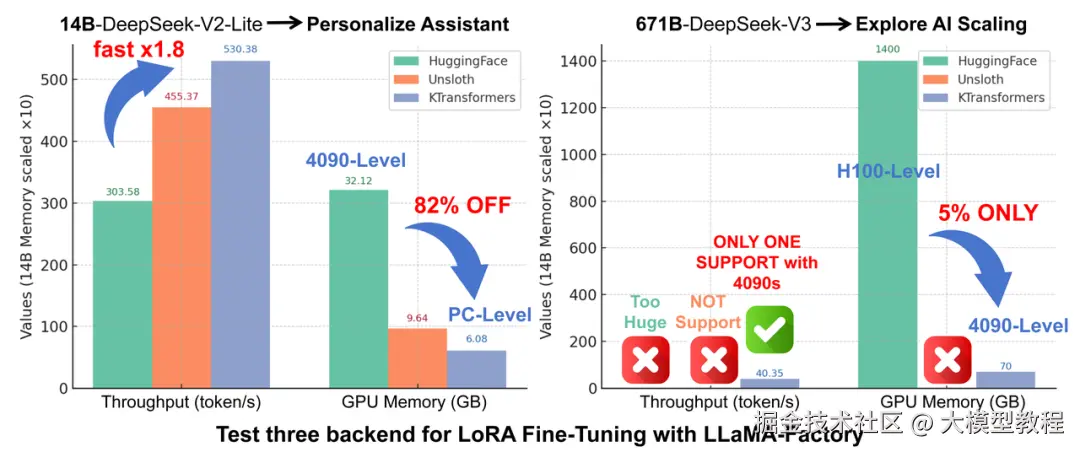 虽然LLaMA-Factory有HuggingFace默认后端、Unsloth后端以及KTransformers后端,但经团队对比测试,KTransformers是目前唯一能在2~4张 24GB 4090卡上微调671B规模MoE模型的方案;同时在14B规模的MoE模型上,相比另两种方案也具有更高的吞吐速率和更低的GPU显存占用。