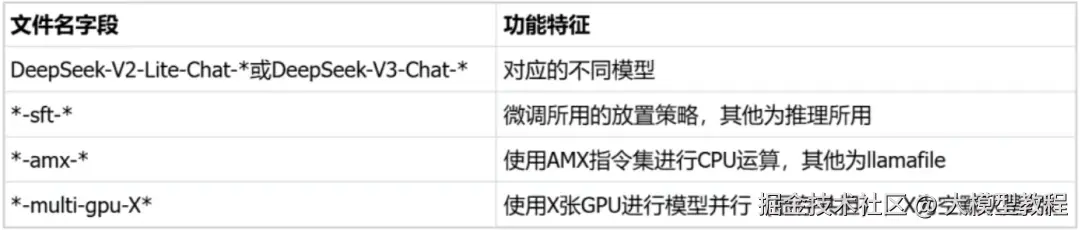 ### modelmodel_name_or_path: opensourcerelease/DeepSeek-V3-bf16trust_remote_code: true### methodstage: sftdo_train: truefinetuning_type: loralora_rank: 8lora_target: all### datasetdataset: identitytemplate: deepseekcutoff_len: 2048max_samples: 100000overwrite_cache: truepreprocessing_num_workers: 16dataloader_num_workers: 4### outputoutput_dir: saves/Kllama_deepseekV3logging_steps: 10save_steps: 500plot_loss: trueoverwrite_output_dir: truesave_only_model: falsereport_to: none # choices: [none, wandb, tensorboard, swanlab, mlflow]### trainper_device_train_batch_size: 1gradient_accumulation_steps: 8learning_rate: 1.0e-4num_train_epochs: 3.0lr_scheduler_type: cosinewarmup_ratio: 0.1bf16: trueddp_timeout: 180000000resume_from_checkpoint: null### ktransformersuse_kt: true# use KTransformers as LoRA sft backendkt_optimize_rule: examples/kt_optimize_rules/DeepSeek-V3-Chat-sft-amx-multi-gpu.yamlcpu_infer: 32chunk_size: 8192其中,kt_optimize_rule用于控制计算资源的放置策略。下为针对YAML文件名和功能对照特别说明,也可参考*github.com/kvcache-ai/…_rules目录。( 表示通配符):