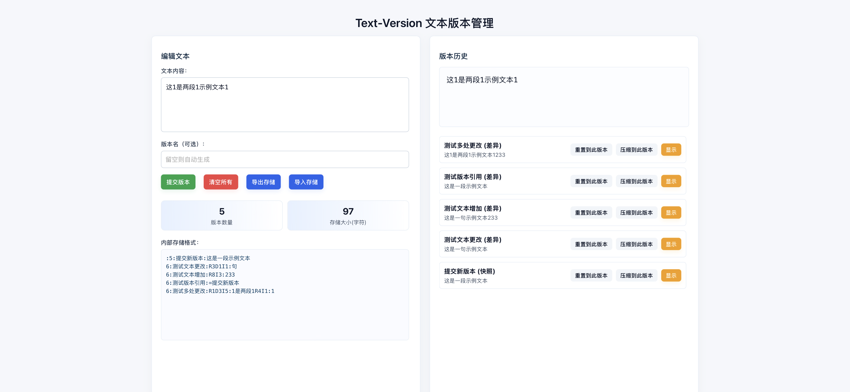 // 创建实例const tv = new TextVersion();// 提交新版本let storage = tv.commit('', '你好,世界!', 'v1');storage = tv.commit(storage, '你好,世界!\n 这是第二行。', 'v2');storage = tv.commit(storage, '你好,TypeScript !\n 这是第二行。');// 查看版本历史console.log(tv.log(storage));//[// { version: 'v1', isSnapshot: true },// { version: 'v2', isSnapshot: false },// { version: 'ycdf93', isSnapshot: false }//]// 查看指定版本console.log(tv.show(storage, 'v1')); // "你好,世界!"// 查看最新版本console.log(tv.latest(storage));// "你好,TypeScript !\n 这是第二行。"console.log(storage);// :2:v1:你好,世界!// 2:v2:R6I8:\\n 这是第二行。// 6:ycdf93:R3D4I11:TypeScript !// 重置到指定版本storage = tv.reset(storage, 'v2');// 压缩存储空间 - 将 v2 设为快照,删除 v1storage = tv.squash(storage, 'v2'); // v1 版本将被永久删除,v2 成为新的起始快照高级示例详见 Github README.