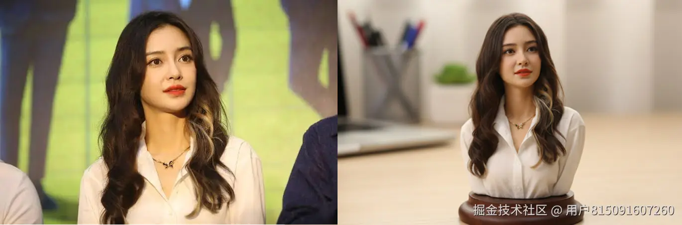 思路:把真人照片转成桌面小摆件(mini figurine)风格,保留面部特征且做出“塑料/陶瓷”质感。