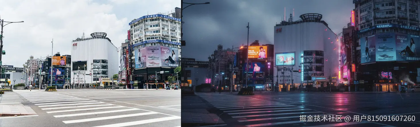 把这张城市街拍重制为赛博朋克电影海报风格:霓虹灯、雨滴反射、冷暖对比、宽银幕构图、加深阴影、电影颗粒,保留主体姿态。步骤:上传原图 → 指定 “风格:赛博朋克” → 要求“宽银幕构图+高对比”。