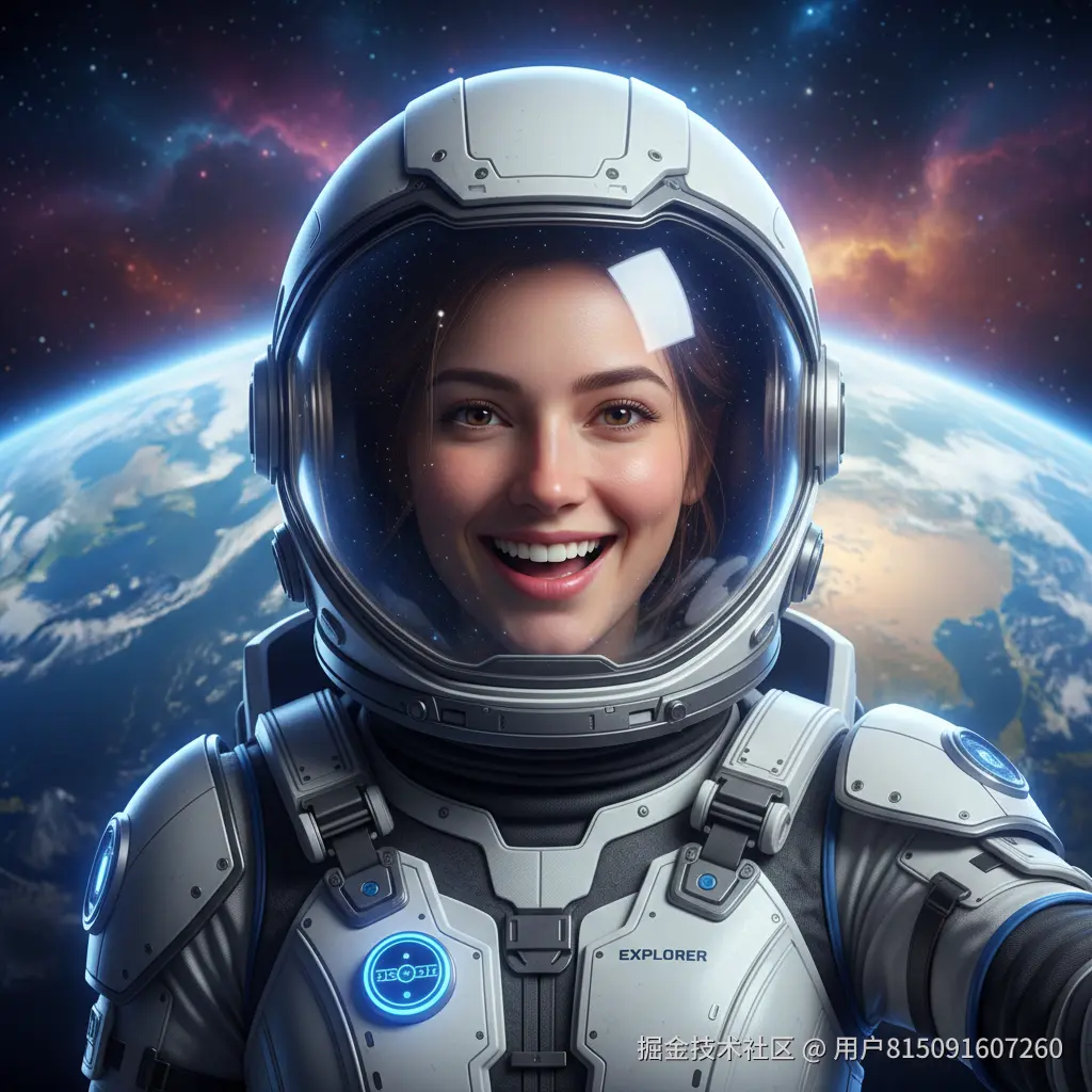 主体:正面自拍,微笑,年约25岁女性;动作:面向镜头,头戴透明头盔,身体穿宇航服;风格:科幻写实,细节丰富;环境:太空背景,地球在远处,可见星云光晕;光照:来自右上方的冷色主光,柔和反射;保留:保留眼睛和面部特征;输出:可用于头像,裁剪为方形实用技巧