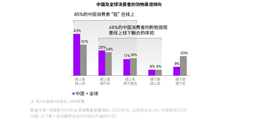 中国消费者的购物渠道偏好呈现出独特特征:85%的中国消费者“逛”在线上,远高于全球平均水平。其中43%习惯线上逛、线上买,42%选择线上逛、线下买,形成独特的线上线下融合模式。