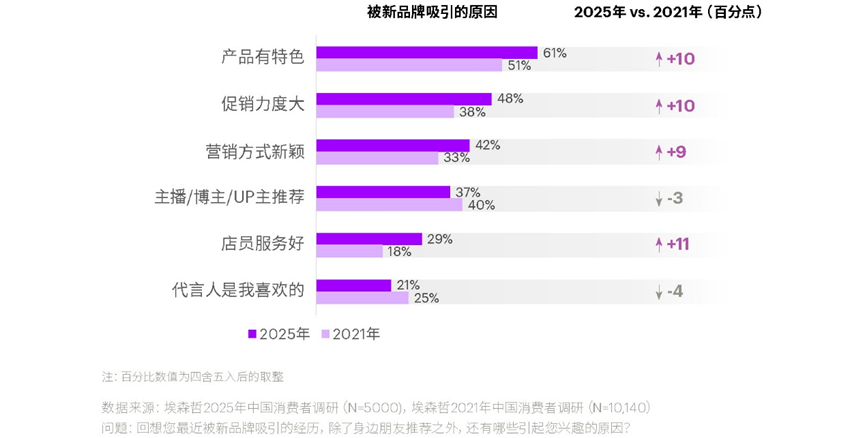 信任机制的重构加剧了这一趋势。产品特色、促销力度和营销新颖度对吸引新客户的影响力大幅提升约10个百分点,而主播推荐和明星代言的影响力则明显下降。消费者不再盲从KOL,而是更相信自己的判断力。