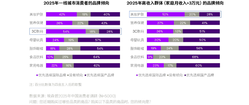图(左):超半数的一线城市受访者在3C数码品类倾向国际品牌,