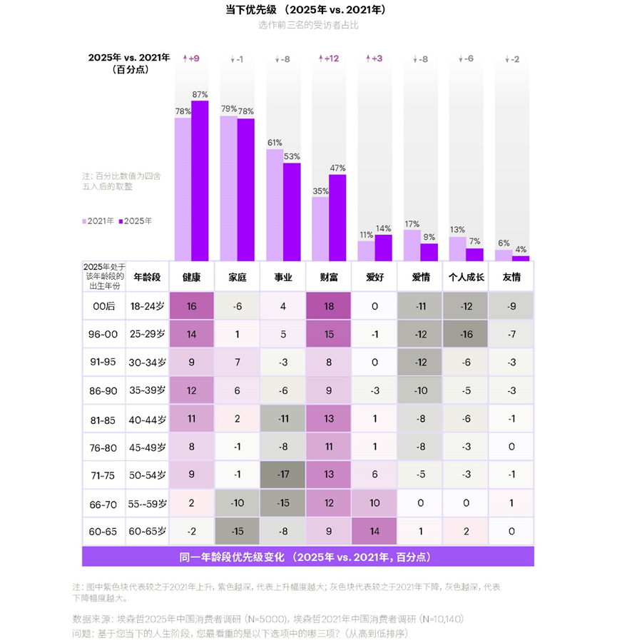 数据揭示了一个明显的趋势:中国消费者的心态正在从理想主义向现实主义收缩。对健康和财富的关注度分别上升9个和8个百分点,而对事业、爱情和个人成长的重视程度则全面下降。