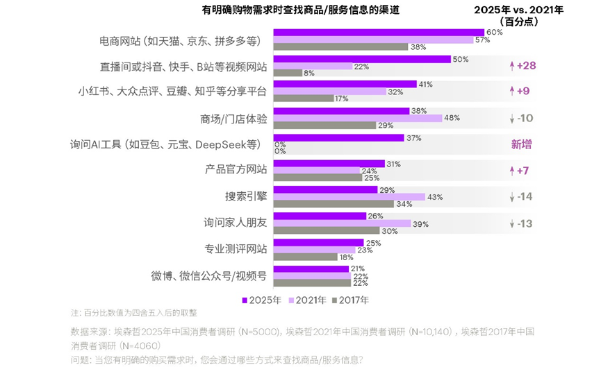 消费触点的大迁移揭示了更深层的变革:直播间和视频平台成为第二大信息渠道,相比2021年激增28个百分点;而家人朋友的意见影响力则暴跌13个百分点。消费者的信息获取正从熟人社会向数字社会全面转型。