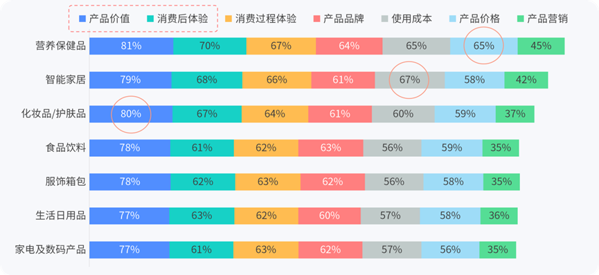 这一趋势在不同品类中呈现出差异化表现。智能家居消费者更关注“使用成本”(67%),反映对长期体验的考量;化妆品/护肤品则兼顾“产品价值”(80%)与“情绪体验”。