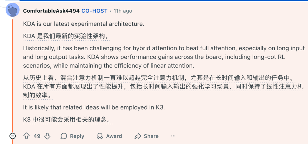 当被问及下一代架构时,团队解释了最新实验性混合注意力机制KDA(Key-Dependent Attention)的优势,还透露有可能用在下一代K3中。