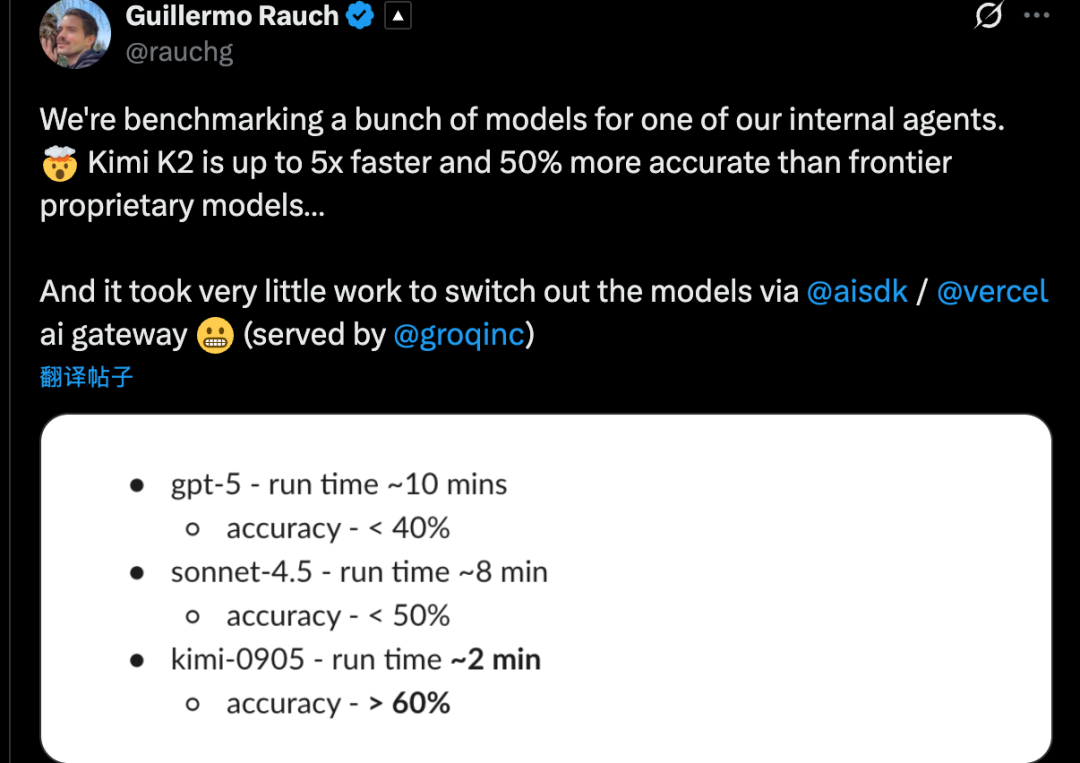 云端开发平台Vercel CEO也分享了内部测试结果,称Kimi K2比闭源模型快5倍,准确率还高50%。