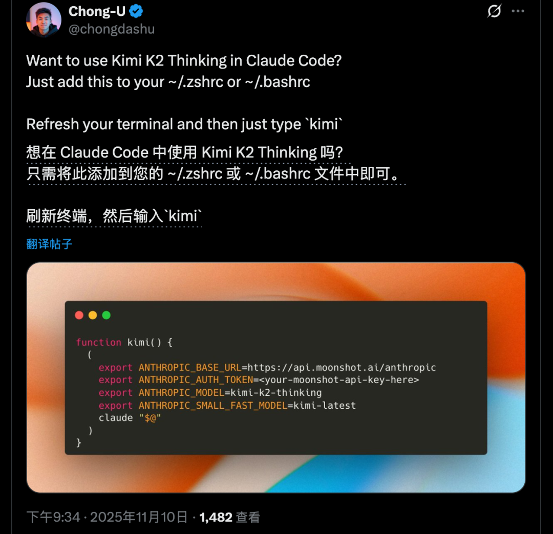 Claude Code用户也在相互传授把模型改成Kimi K2的设置方法。