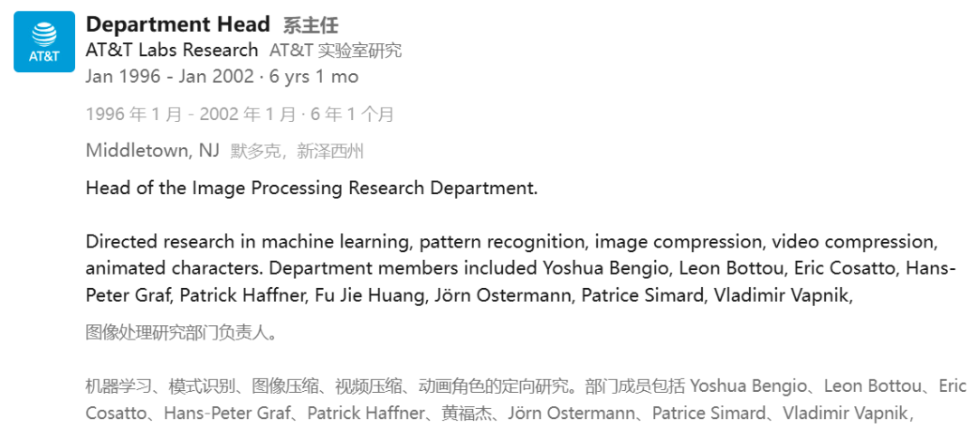 LeCun留在了AT&T,负责一个专注于图像处理研究的实验室小组。