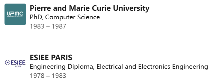 后来,他在法国精英工程师学校之一的巴黎高等电子与电工工程师学院(ESIEE Paris)获得了相当于硕士的学位。在那里,他专注于微芯片设计与自动化。