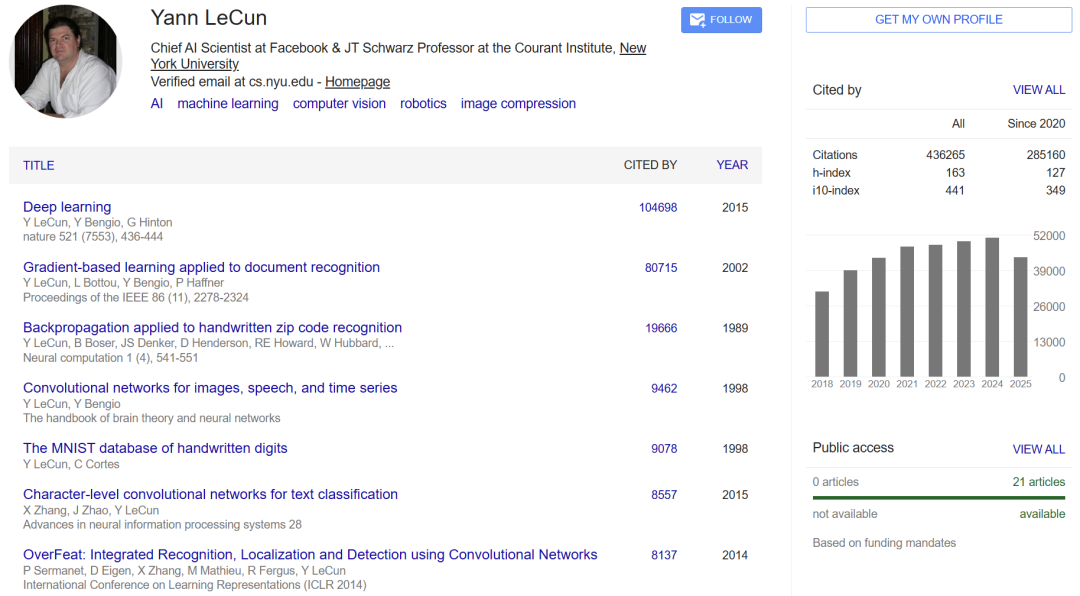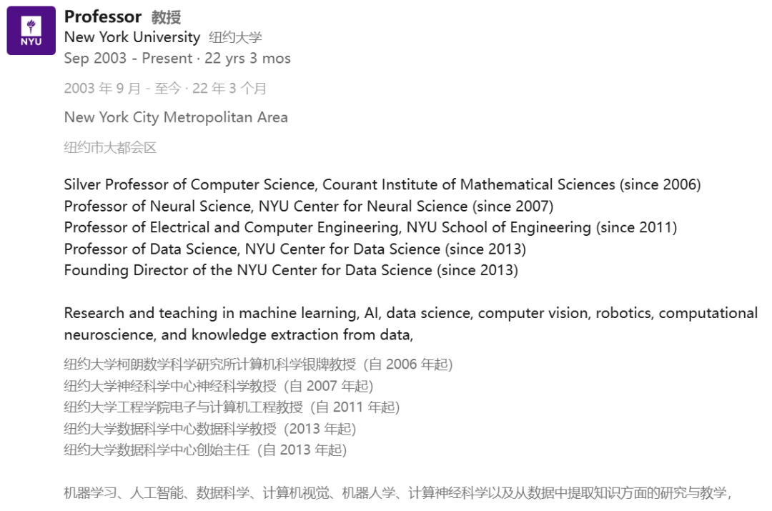 2003年,LeCun离开工业界,前往纽约大学库朗数学科学研究所担任计算机科学教授。