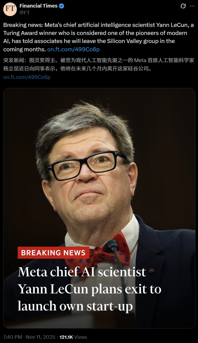 刚刚,FT独家爆料,现任Meta首席AI科学家LeCun,决定将在未来几个月离职。