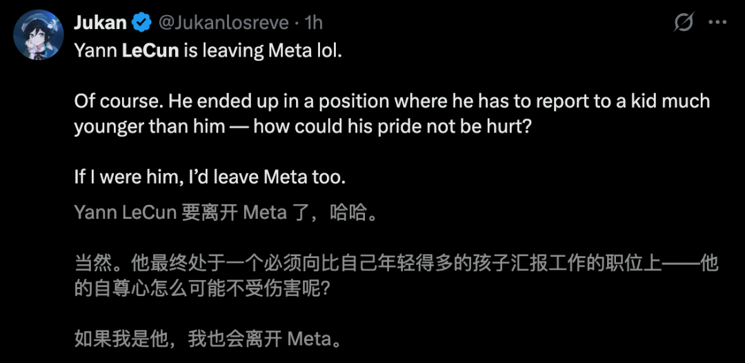 有网友表示,这并不意外。另有人调侃道,「要始终向一个孩子汇报工作,LeCun的自尊心怎么不会受到伤害呢」。