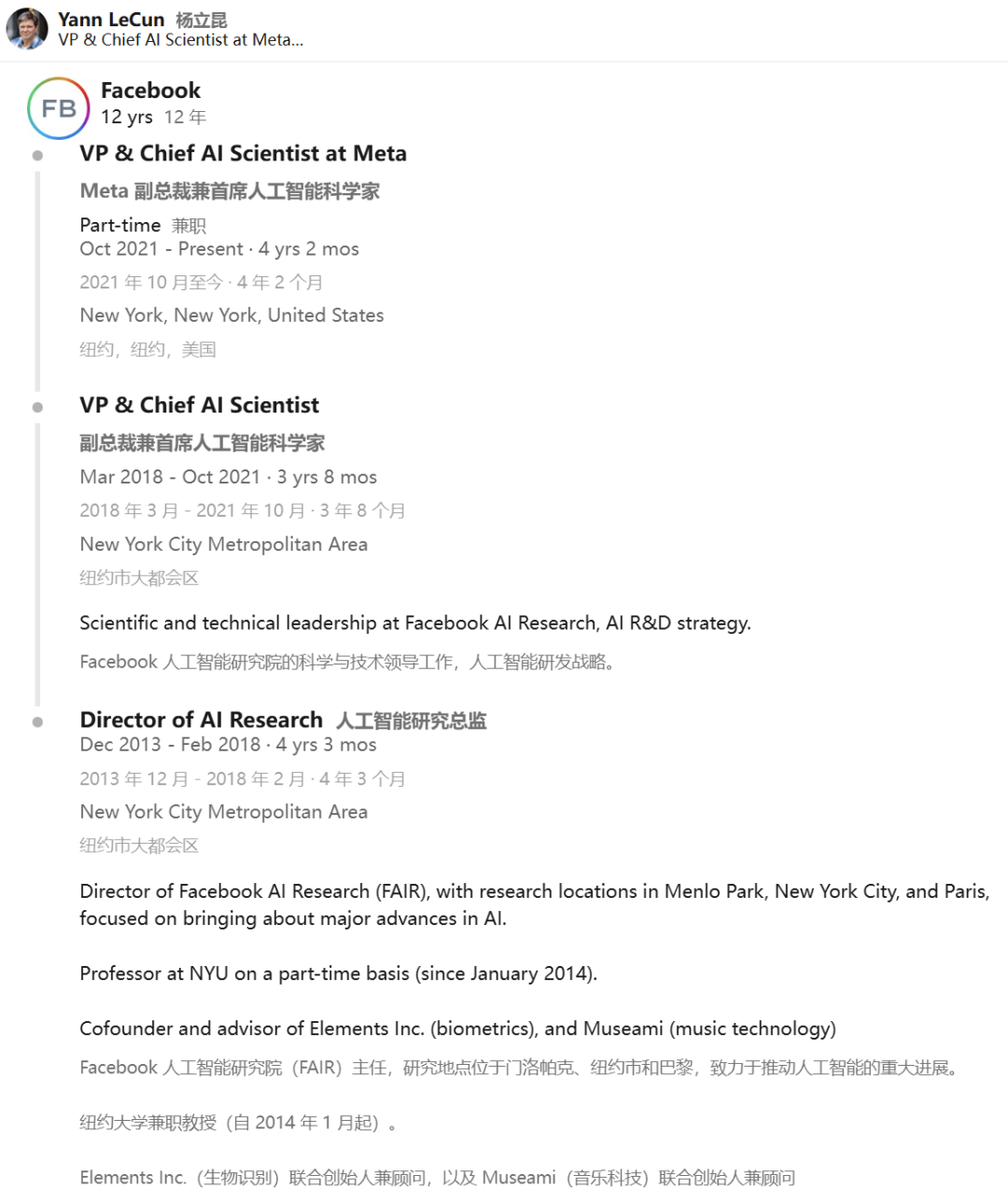 2018年,他卸任主任一职,转任Facebook首席人工智能科学家,专注于战略规划和科学领导力。