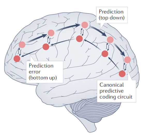 回到双目竞争的例子,IIT解释了为什么受试者报告说看到了一栋房子(而不是一张脸)。IIT所主张的假说是,受试者的报告所依据的情结,与对应于内容“房子”(而不是内容“脸”)的概念结构有关。而且,IIT用对应概念结构的“形状”,来解释看到房子和看到脸这两种体验的区别。虽然IIT对意识的各个方面提供了比大多数ToC更全面的处理,但它对意识和心智的其它方面(如注意力、学习和记忆)的关系说得比较少,而且也没有关注意识的具身性(embodiment)和环境嵌入性(environmental embeddedness)(后两者也是HOT和GWT的挑战)。尽管如此,IIT理论家们已经开始解决其中的一些挑战。例如,他们开发了“匹配复杂度”的测量方法,可以跟踪智能体和其环境之间的共享信息;制定了基于智能体的模型,并发现,能够有效地与周围环境接触的智能体,会表现出更多的整合信息[62-64]。最后,我们考虑两种理解意识的整体路径,它们强调自上而下的信号在塑造和促成意识知觉方面的重要性。第一类——复馈理论(re-entry theories)——本身就是一种ToC,将有意识的知觉与自上而下的(循环的、复馈的)信号联系起来[65, 66]。第二类——预测处理理论(predictive processing theories)——本身不是ToC,但是是对大脑(和身体)功能的更一般的描述,可以用来解释和预测意识的属性[67]。复馈理论的动机是,神经生理学揭示了自上而下信号对有意识的知觉(通常是视觉)的重要性(例子见参考文献68-70)。在一个著名的复馈理论——局部循环理论(local recurrency theory)中,Lamme认为,在知觉皮层内的局部循环或复馈,足以产生意识(前提是其它有利因素具有完整性,比如脑干的唤醒)。但可能需要顶叶和额叶区域来对知觉体验的内容进行报告,或利用它们进行推理和决策[65,71](图4)。图4:复馈/预测处理理论。复馈理论和预测处理的核心主张是,有意识的心理状态,与自上而下的信号传递(复馈;粗箭头)有关;对于预测处理来说,这些信号传递的,是对感觉信号原因的预测(细箭头表示自下而上的预测误差);因此,对预测误差的不断优化,近似于贝叶斯推理。在大多数预测处理理论中,意识的内容是由自上而下的预测内容所指定的。支持这些理论的证据,来自于一些将自上而下的信号与知觉体验联系起来的研究[68-70, 160]。大量的研究进一步支持了预测处理理论,证据表明,预期(expectation)塑造了意识知觉的内容与速度[161-163],其中,有一些研究将其与自上而下的信号传递直接联系起来[160]。不过,如果有证据表明,自上而下的信号传递或预测处理,会在没有意识的情况下发生,或者这些过程的变化不影响意识状态,那么这些理论就会受到挑战。