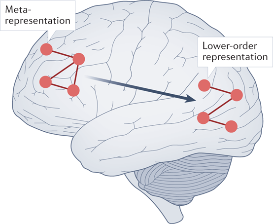 所有高阶理论(HOT)共有的核心主张是,某种精神状态是有意识的,当且仅当它成为某种元表征状态指向的目标。元表征不仅仅指在层次化处理结构中位于更高层或更深层的表征,而是指以其它表征为指向目标的表征(图1)。例如,内容为“我正在经历的视觉体验中包含一个正在移动的点”的表征是一个元表征,因为它的内容涉及自己对世界的表征,而不是世界本身。不同HOT之间的重要区别之一,是它们对负责意识的元表征的性质和作用的解释不同。某些HOT发现某些元表征对包含思想的意识(或类似思想的状态)至关重要[30-32]。另一些HOT则从计算的角度进行说明。在自组织元表征解释中,高阶大脑网络将低阶网络编码的表征重新编码成元表征,这一过程与意识有关[33, 34]。此外,高阶状态空间理论提出,主观报告(例如,诸如“我感知到了X”之类的陈述)是关于感知内容的生成模型的元认知(高阶)决策[35]。然而,感知现实监测理论(perceptual reality monitoring)假设,当高阶网络将某个一阶表征当做外部世界的可靠反映时,意识感知就会产生[36, 37]。正如前文所述,HOT专注于解释为什么有些内容是有意识的,而另一些则没有。但下述HOT也不局限于解释这一点——它们也能用来解决有关局部状态的体验特征的问题。一个典型的例子考察了这样一种(有争议的)直觉,即感知体验的内容通常超过“一阶”感官表征中的有效信息,比如周边视觉体验[38,39]。对此,基于HOT的假说认为,周边视觉体验“膨胀”的现象是由一阶状态的高阶表征错误造成的。HOT方法还能解释为什么某些内容是不可能有意识的(它们不能成为适当的元表征状态的目标),以及为什么某些内容必然是有意识的(它们必然伴随有适当的元表征状态)。HOT很少关注意识的全局状态,但他们能够根据(元)表征过程的完整性来解释全局状态之间的区别。一个特别有趣的问题是HOT能否(如果能,如何)解释各种体验的独特体验特征。为什么欣赏日落的体验特征与头痛的体验特征如此不同?对于这个问题,HOT的回应大体如下:一个状态的体验特征是由相关的元表征状态赋予它的属性决定的。大多数这类解释都集中在视觉体验上[40],但也有解释情绪状态[41]和元认知状态的工作,例如在感知决策过程中,自信的感觉是什么样的[42, 43]。最后,任何完全还原论版的HOT都必须解释为什么各种属性的表征会产生相应的体验,以及神经活动最初如何使这些属性呈现。HOT主要解释了心智状态具有意识的原因,因此,该方法不提出任何关于意识功能的特定观点。事实上,一些HOT淡化了意识具有独特功能的观点[44]。另一些版本的HOT,通过与信念判断和错误监测相关的元认知过程,来鉴别意识的功能作用[45]。此外,尽管HOT允许有意识的心智状态伴随有意识的元认知判断——例如显式的行为监测或主观信念的报告——但大多数HOT并不要求有意识的感知必然伴随相应的有意识的元认知状态。相反,若元表征想要被意识到,它必须成为合适的元表征状态的对象。从意识的神经基础角度考虑,对元表征的着重关注导致HOT研究者们着重强调前部皮层区域,特别是前额叶[30],因为这些区域与复杂的认知功能相关。然而,尽管大多数HOT认为前半部分大脑产生意识,但对于具体哪些区域(或过程)是产生意识所必须的,仍有分歧[46]。图1:高阶理论。意识的高阶理论(HOT)的核心主张是,心智状态有意识的原因是它成为了特定种类的元表征指向的目标。例如,后部皮层中的视觉信号的低阶表征,在被正确类型的高阶元表征所指向时,将提供有意识的视觉感知。认为前部皮层区域,特别是前额叶区域,参与意识内容的产生的实证研究,是HOT的支持性证据,特别是当有意识和无意识状态都与之匹配时[30,100]。将元认知与前额叶区域联系起来的病变证据,也间接地支持HOT[153]。HOT也受到一些实证研究的挑战,比如某些研究认为前部区域与意识无关[108, 154],它可能只是为了实现主观报告和执行控制而存在[6]。